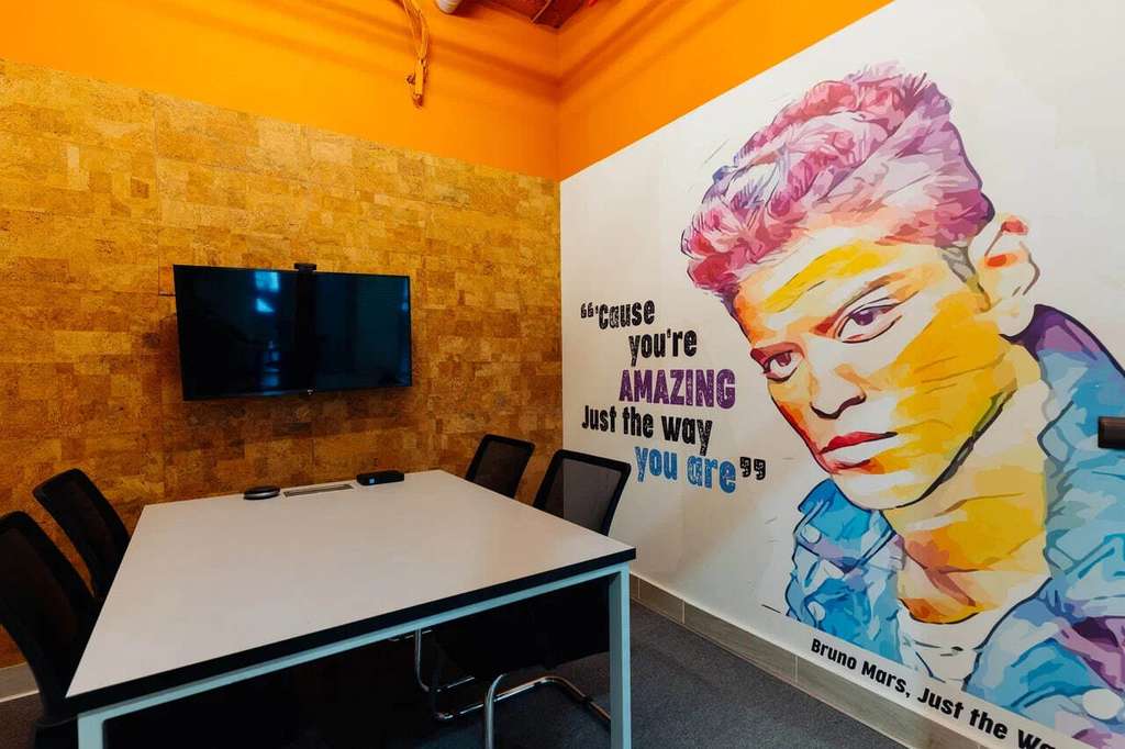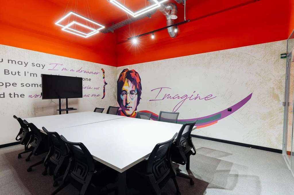- Оборудованные переговорные комнаты: 4К телевизор/проектор, спикерфон с камерой, доска с маркерами.
